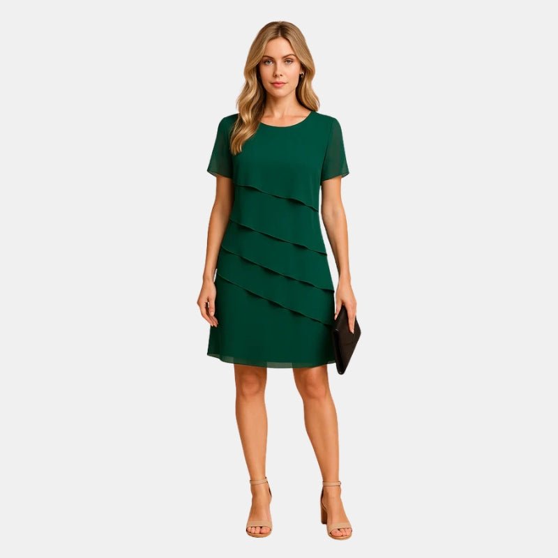Ta letnia mini sukienka posiada elegancki warstwowy fason oraz krótki rękaw. Zwiewne warstwy podkreślają sylwetkę i zapewniają komfort, dzięki czemu idealnie sprawdzi się na uroczystości i specjalne okazje.