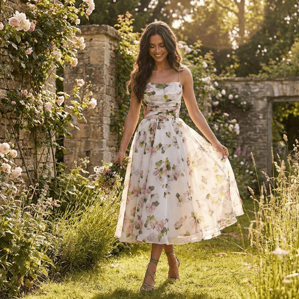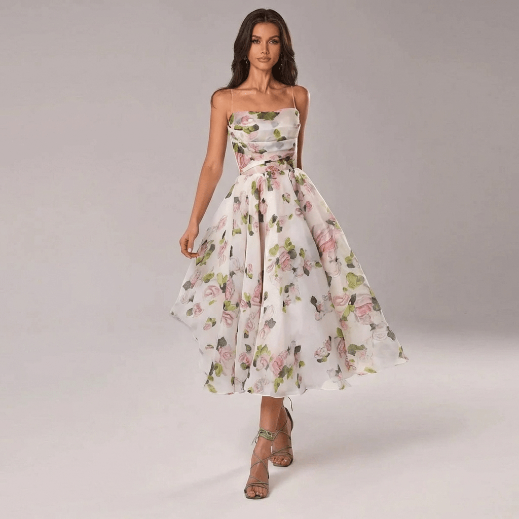 Ta damska sukienka letnia posiada delikatne ramiączka oraz romantyczny kwiatowy wzór. Dopasowana góra i rozkloszowany dół tworzą kobiecą sylwetkę. Idealna na lato, wakacje i wyjątkowe okazje.