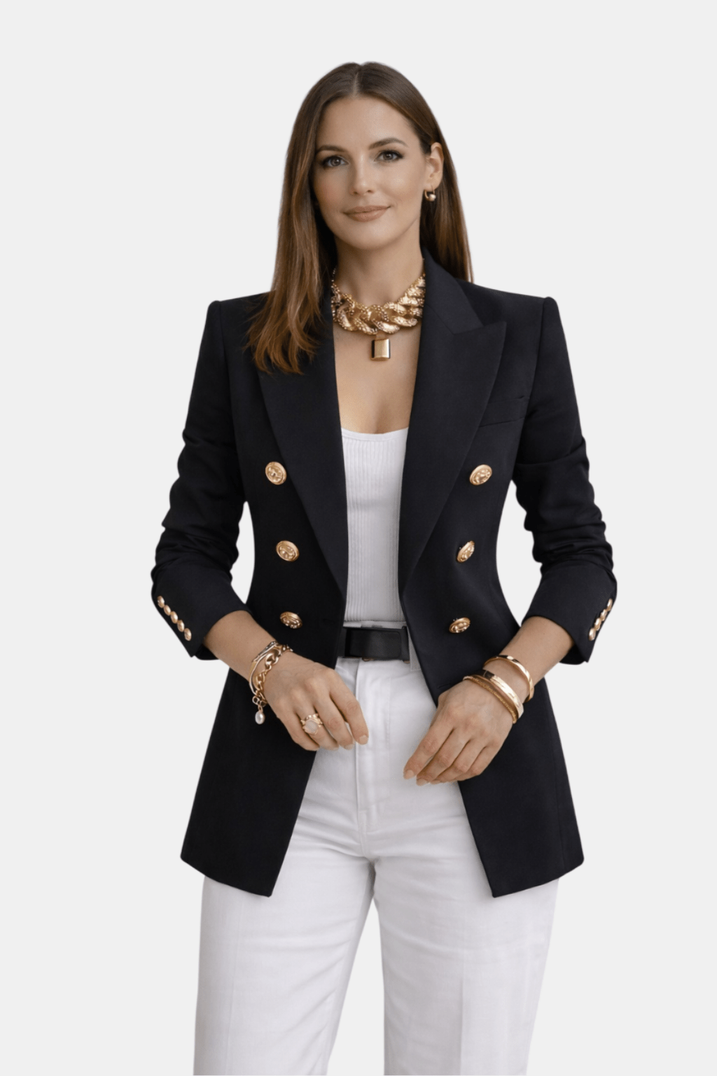 Elegancka Wiosenna Marynarka Dwurzędowa ze Złotymi Guzikami łączy klasyczny styl z nowoczesną elegancją. Dopasowany krój, dwurzędowe zapięcie oraz złote guziki nadają stylizacji luksusowego charakteru. Idealna do biura, spotkań oraz eleganckich wiosennych outfitów.