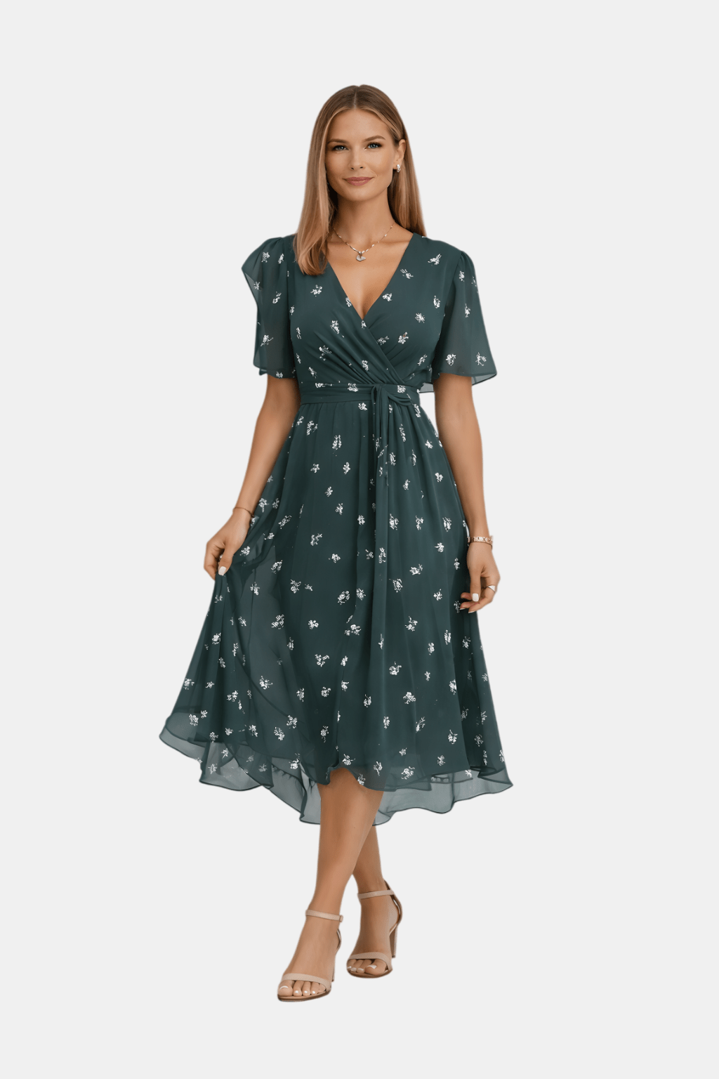 Elegancka Wiosenna Sukienka Kopertowa Midi łączy dekolt V, lekki materiał i stylowy fason kopertowy, który pięknie podkreśla sylwetkę. Idealna na wiosenne wyjścia, spotkania i codzienne stylizacje.