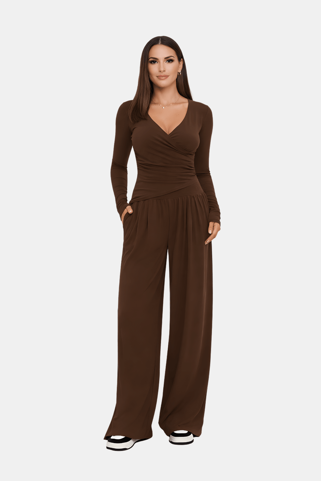 Luźny Zestaw z Szerokimi Spodniami to doskonałe połączenie wygody i codziennego stylu wiosennego. W zestawie znajdziesz luźne spodnie z szerokimi nogawkami oraz dopasowaną górę, które razem tworzą komfortowy i nowoczesny look.