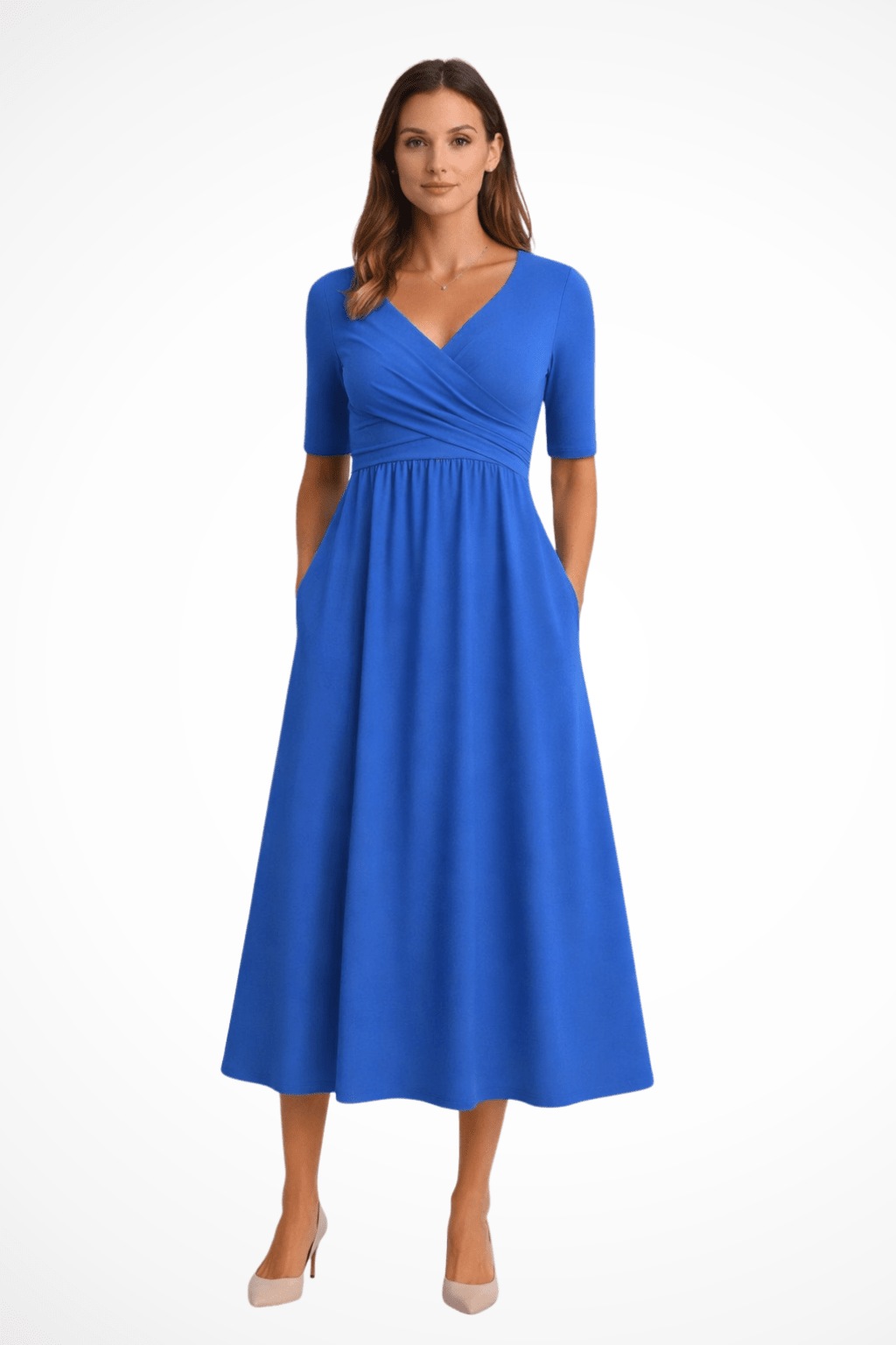Ta letnia sukienka midi posiada kopertowy krój oraz krótki rękaw zapewniający komfort. Lekki materiał i luźny fason sprawiają, że idealnie nadaje się na co dzień, wakacje i letnie stylizacje.