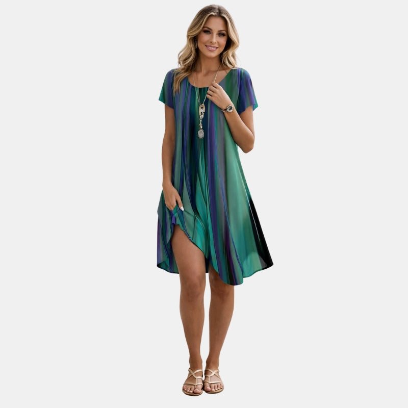 Ta damska sukienka letnia posiada luźny fason oraz stylowy wzór w pasy. Lekki materiał zapewnia komfort w ciepłe dni, a swobodny krój idealnie sprawdzi się w codziennych stylizacjach i na wakacje.
