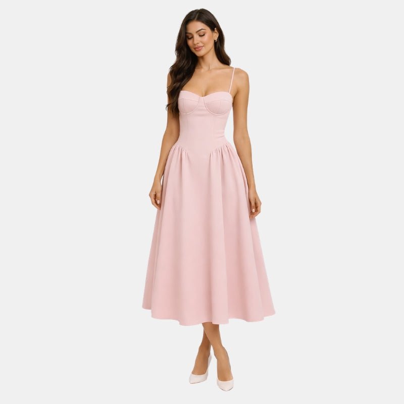 Ta letnia sukienka midi posiada gorsetową górę oraz rozkloszowany dół podkreślający sylwetkę. Cienkie ramiączka i elegancki fason sprawiają, że idealnie nadaje się na wesele i letnie okazje.