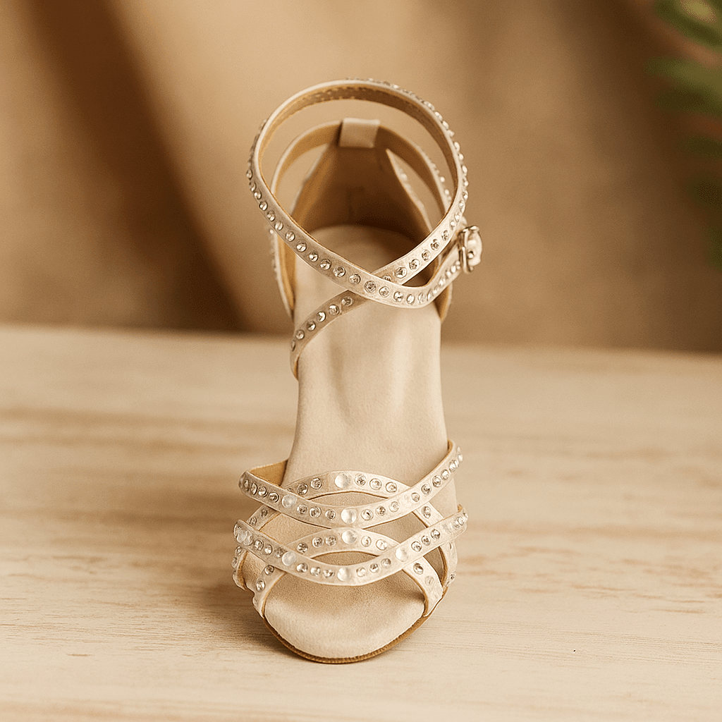 Te damskie sandały na obcasie posiadają ozdobne perły i kryształki oraz pasek wokół kostki zapewniający stabilność. Elegancki fason idealnie sprawdzi się na wesele, przyjęcia i letnie okazje.