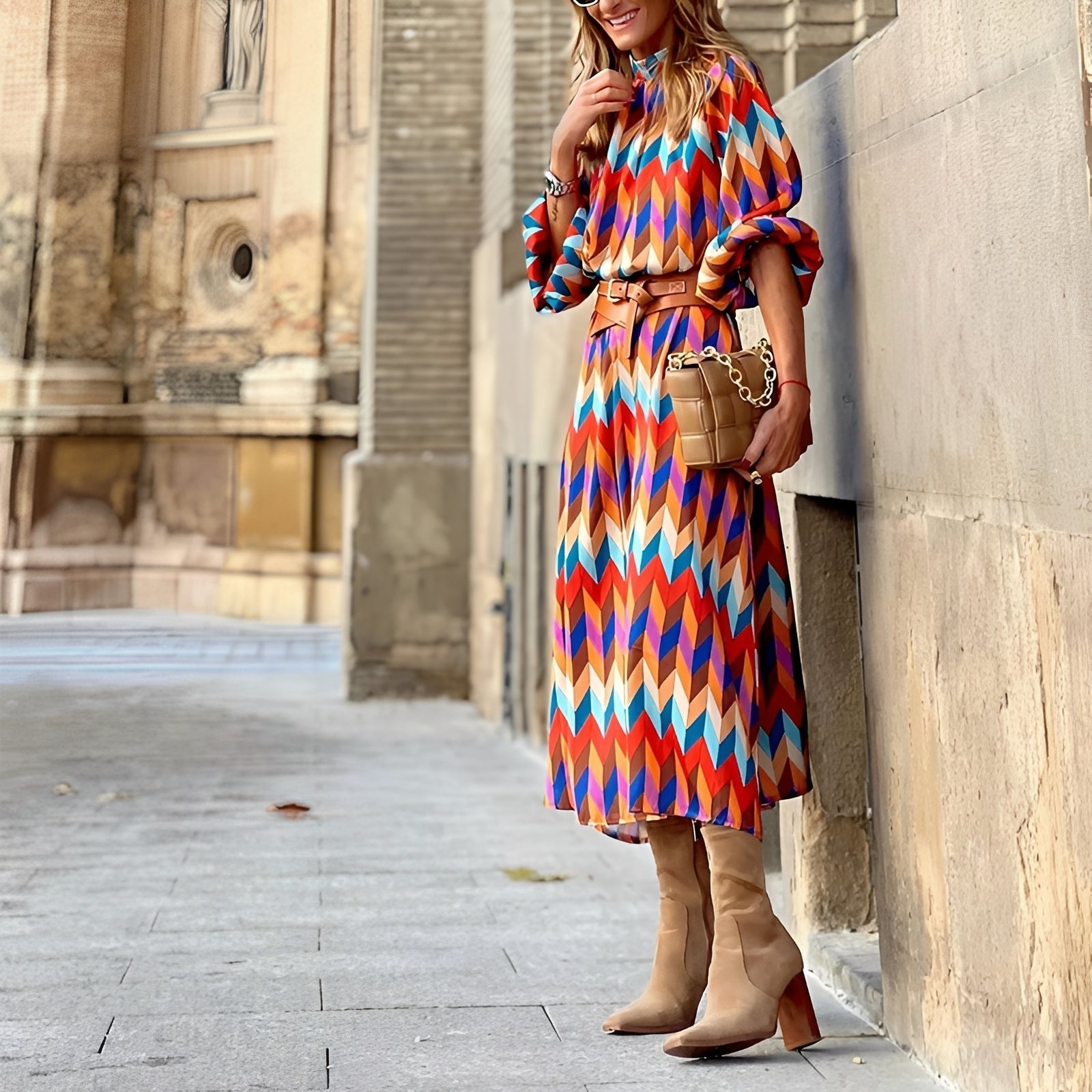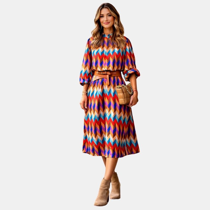 Damska Kolorowa Wzorzysta Wiązana Midi Sukienka
