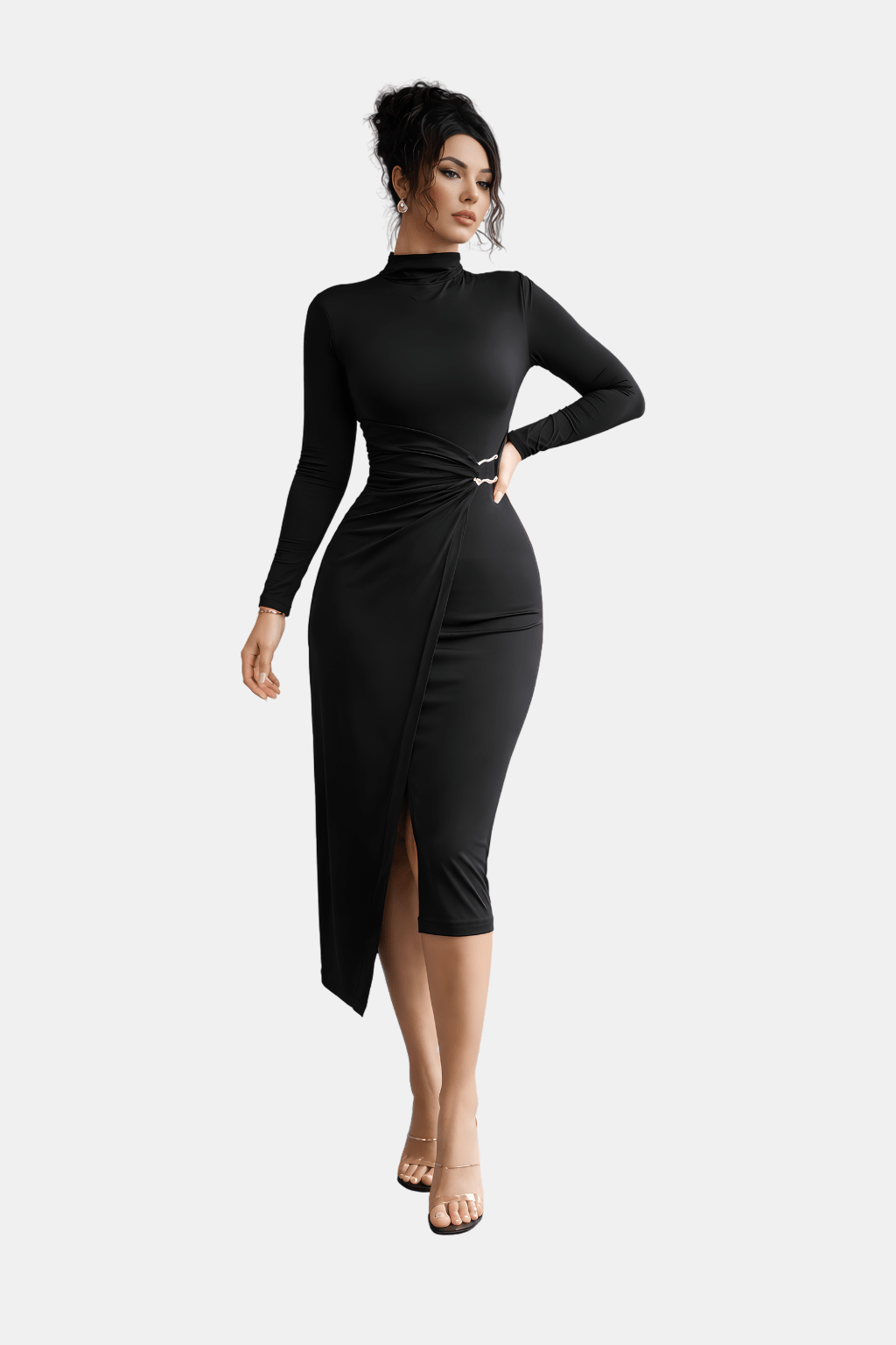 Elegancka Sukienka Midi ze Stójką na Wiosnę to połączenie minimalizmu i kobiecego stylu. Stójka, długie rękawy oraz metaliczny detal nadają jej nowoczesny charakter. Wykonana z elastycznego, miękkiego materiału, doskonale dopasowuje się do sylwetki, zapewniając komfort i elegancję.