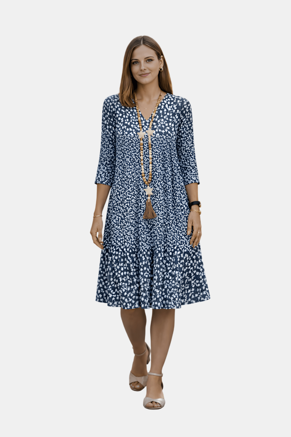 Letnia Sukienka z Kwiatowym Wzorem i Dekoltem V zachwyca lekkim, kobiecym krojem oraz świeżym, wakacyjnym stylem. Zwiewny fason i delikatny kwiatowy print tworzą modną, wygodną sukienkę idealną na letnie dni, spacery, wakacyjne wyjazdy czy spotkania na świeżym powietrzu. Wykonana z lekkiego, oddychającego materiału zapewnia komfort nawet podczas upalnych dni.
