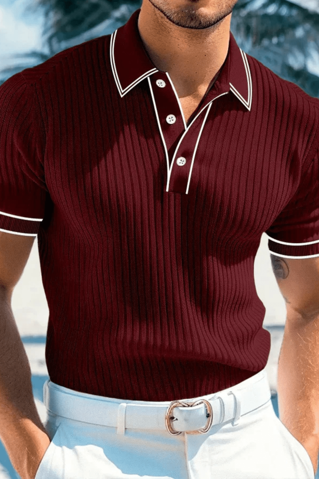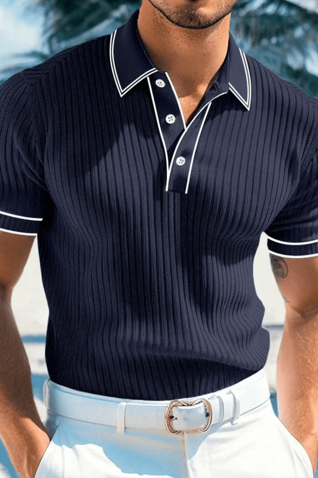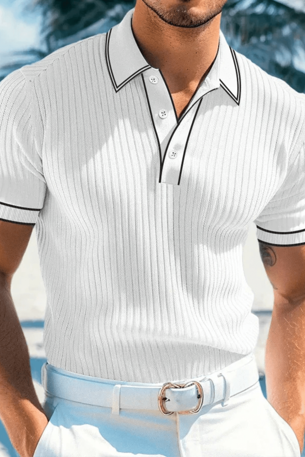 Ta letnia koszulka polo posiada prążkowaną strukturę oraz kontrastowy kołnierz. Dopasowany krój i lekki materiał zapewniają komfort, a nowoczesny styl idealnie pasuje do letnich i casualowych stylizacji.