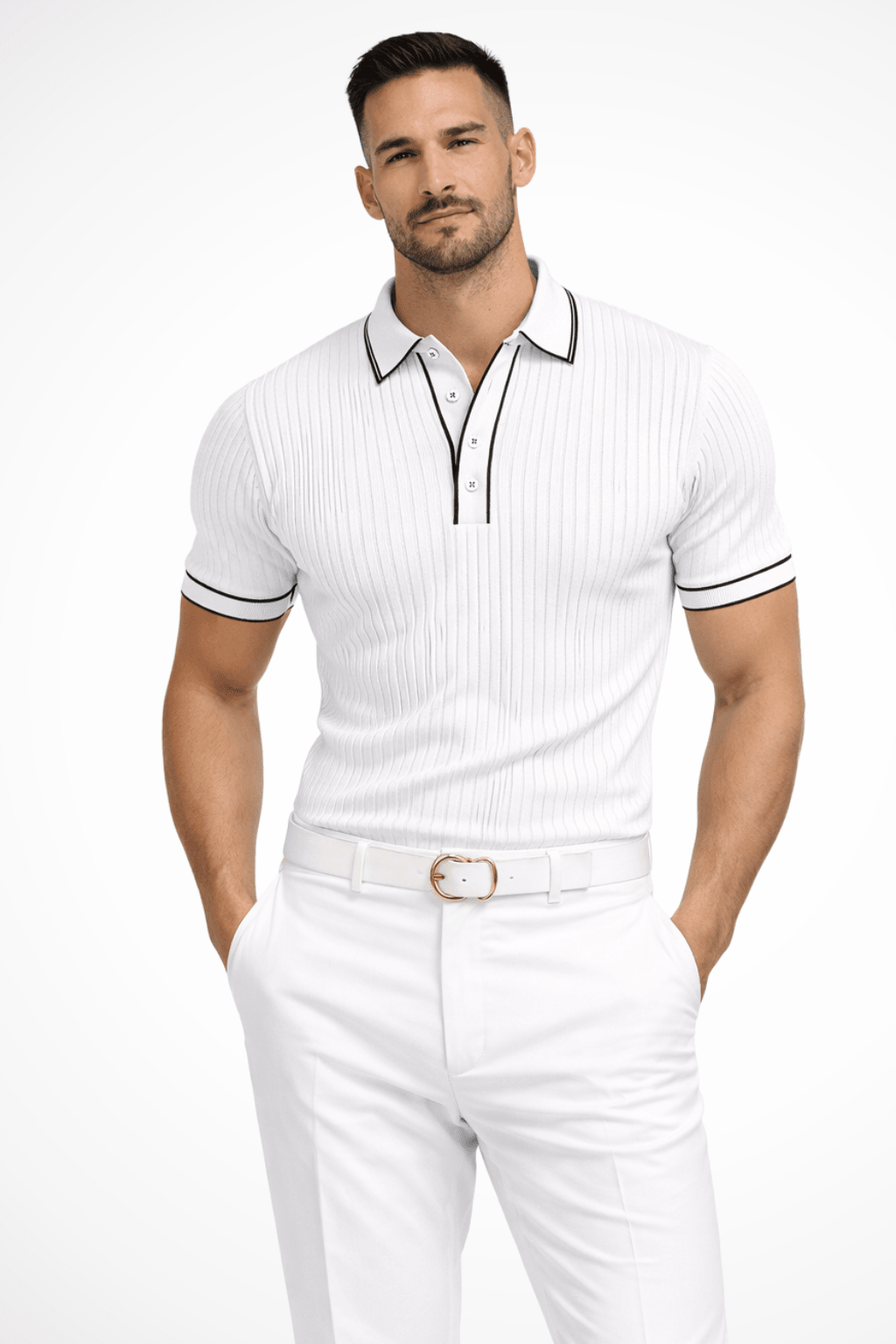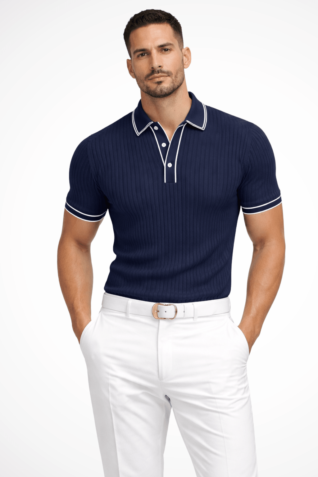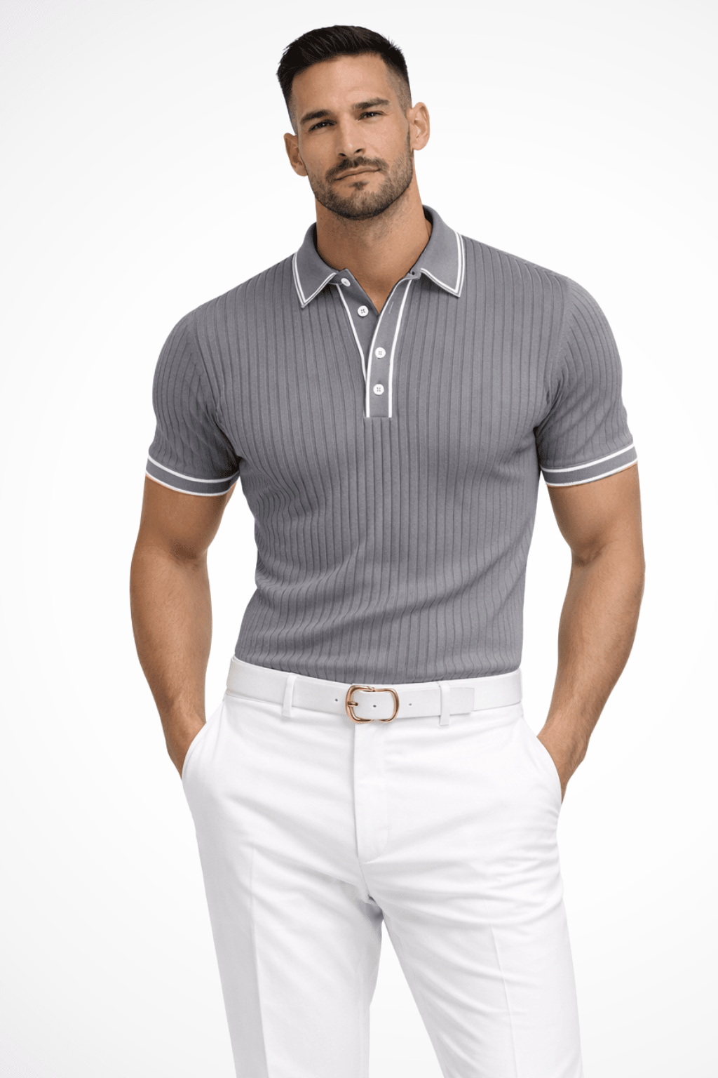 Ta letnia koszulka polo posiada prążkowaną strukturę oraz kontrastowy kołnierz. Dopasowany krój i lekki materiał zapewniają komfort, a nowoczesny styl idealnie pasuje do letnich i casualowych stylizacji.