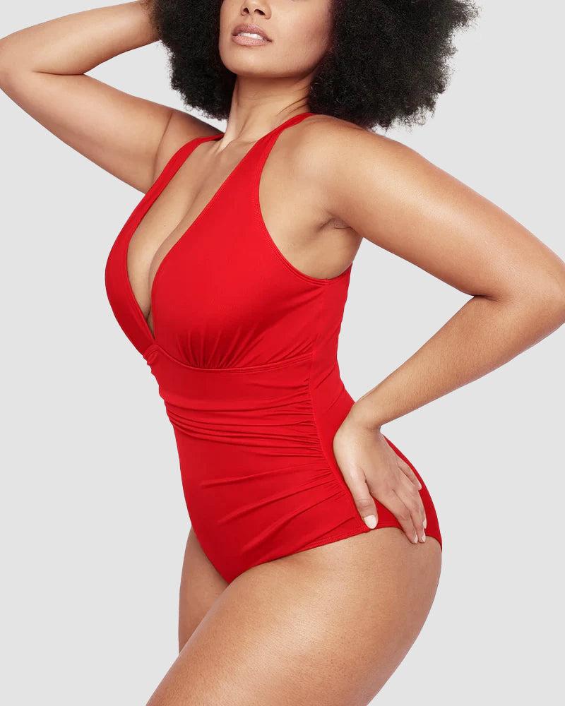 Ten jednoczęściowy strój kąpielowy modelujący podkreśla kobiece kształty i zapewnia lekki, elegancki wygląd na wiosnę. Głęboki dekolt V oraz marszczenie z przodu eksponują biust i talię, a panel modelujący 360° wygładza brzuch.