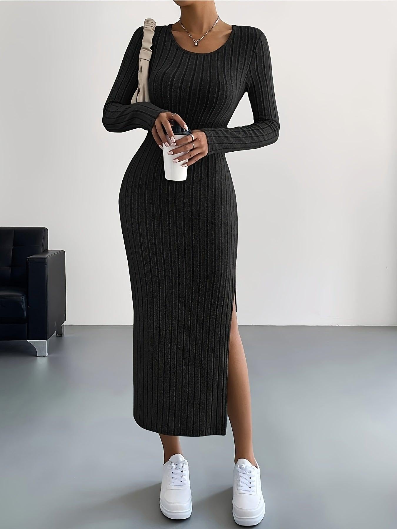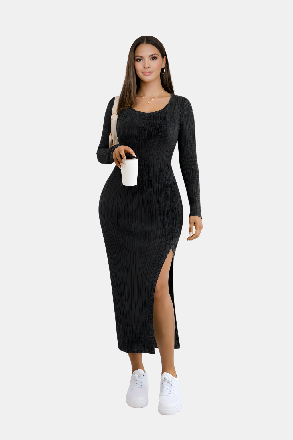 Prążkowana Sukienka Maxi z Długim Rękawem na Wiosnę to połączenie komfortu, subtelnego dopasowania i ponadczasowego stylu. Prążkowana struktura materiału podkreśla sylwetkę, a rozcięcie z boku zapewnia swobodę ruchów i lekkość noszenia.