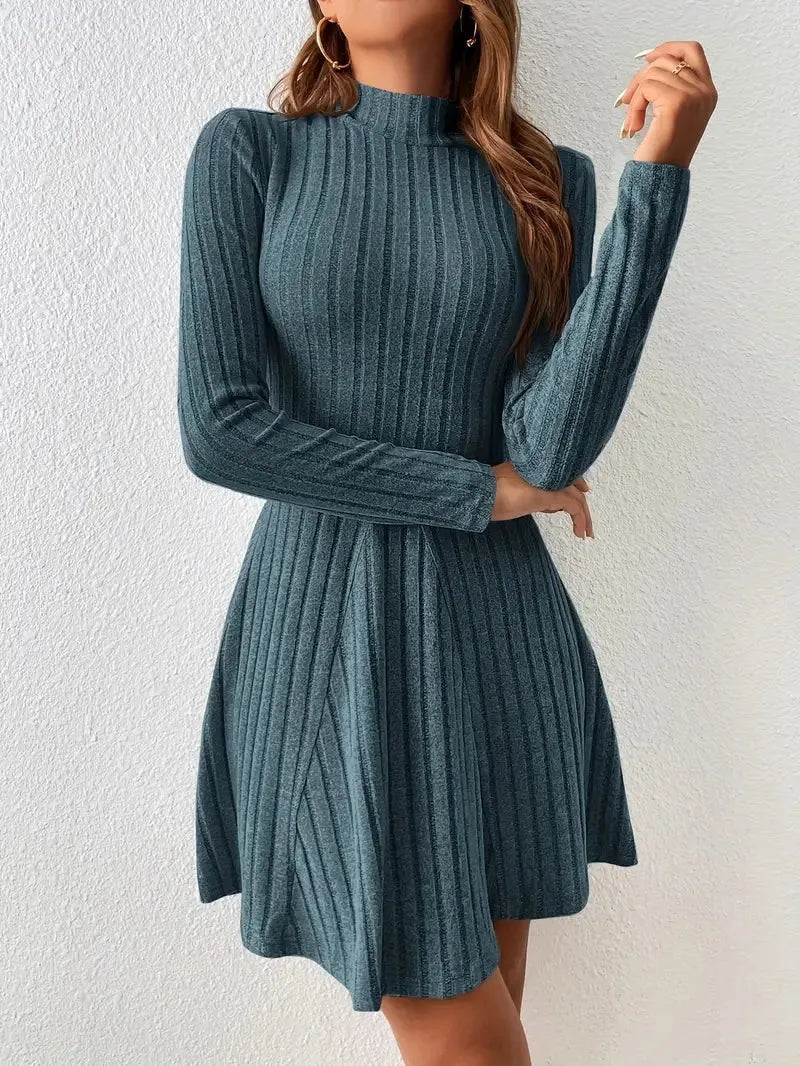 Prążkowana Zimowa Sukienka Mini łączy miękką prążkowaną dzianinę, dopasowany krój oraz stójkę, tworząc stylową propozycję na chłodne dni. Elastyczny materiał podkreśla figurę, zapewniając jednocześnie komfort i swobodę ruchów.