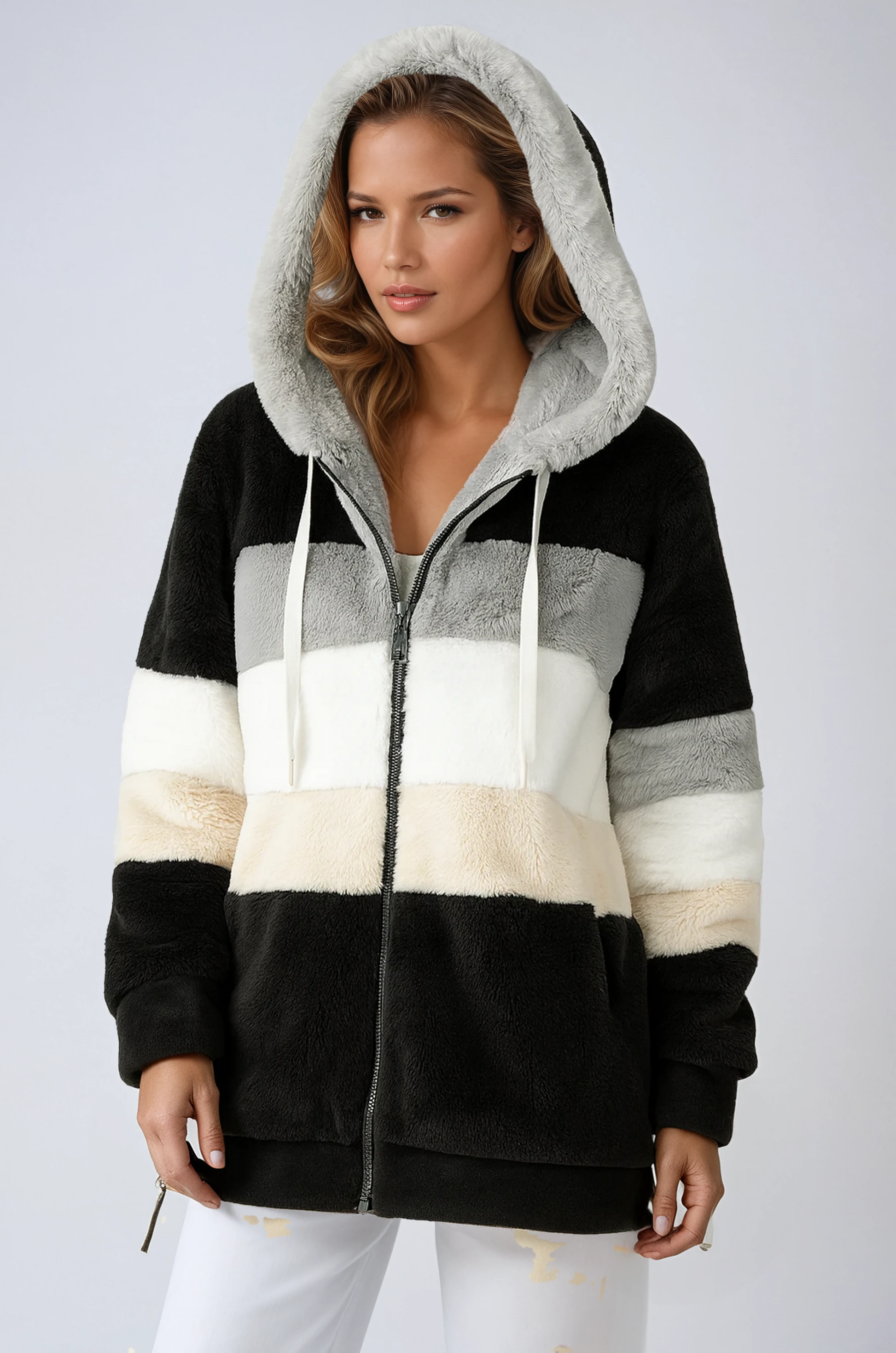 Przytulna Zimowa Bluza Polarowa z Kapturem i Zamkiem to połączenie miękkości, ciepła i modnego designu. Kolorowe pasy dodają nowoczesnego charakteru, a zamek i regulowany kaptur zapewniają wygodę i ochronę przed chłodem.