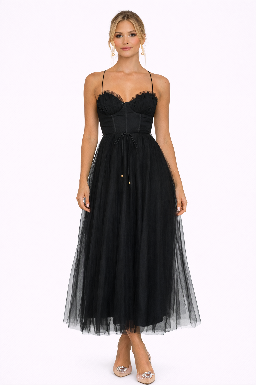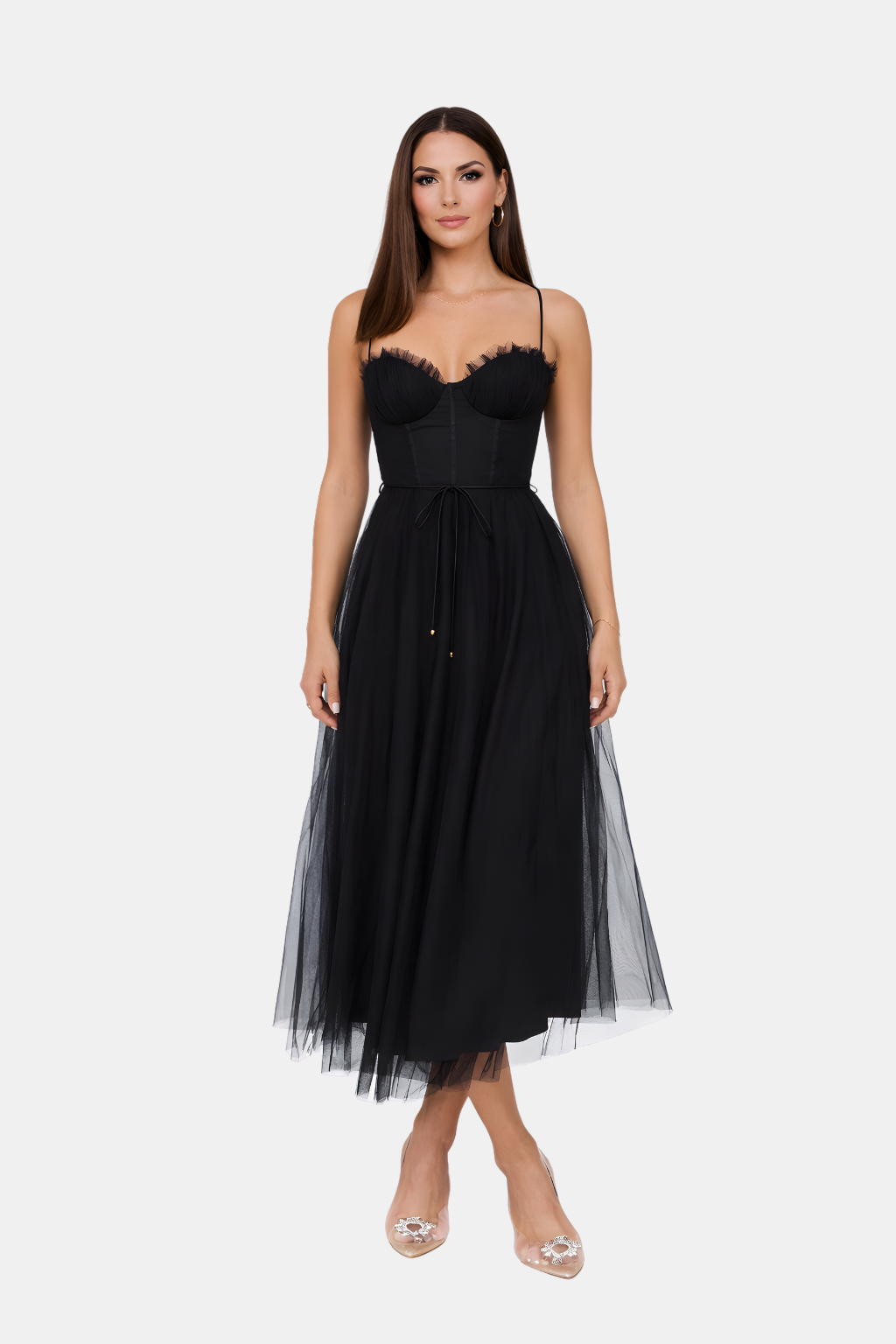 Wiosenna Tiulowa Sukienka Koktajlowa Midi z Gorsetem łączy kobiecą delikatność z eleganckim krojem. Gorsetowa góra podkreśla talię, a lekki tiulowy dół nadaje sylwetce subtelności i lekkości — idealna na wiosenne przyjęcia, wieczorne wyjścia i wyjątkowe okazje.