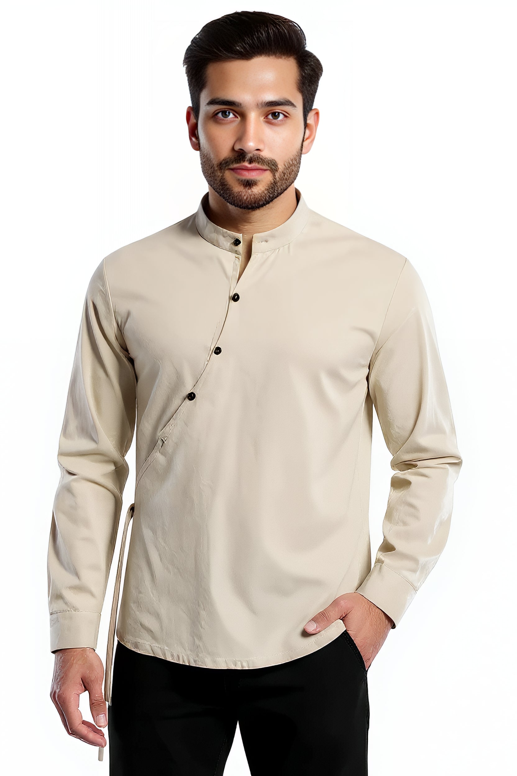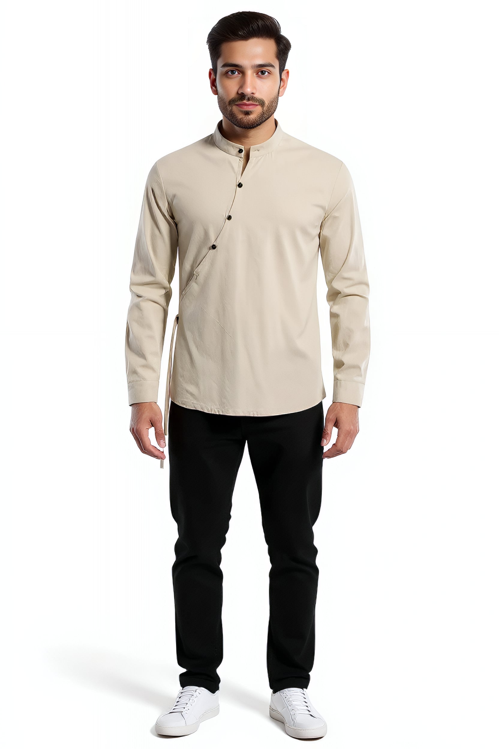 Wzbogać swoją garderobę o tę stylową beżową koszulę z długim rękawem, wyróżniającą się stójkowym kołnierzem i charakterystycznym asymetrycznym zapięciem na guziki. związek z myśleniem o życiu, a klasyczny styl, oferowanie dopasowanego krój, który sprawdzał się zarówno na co dzień, jak i podczas półformalnych okazji. Idealnie pasuje do chinosami lub jeansami — do drugiego elementu każdego mężczyzny.