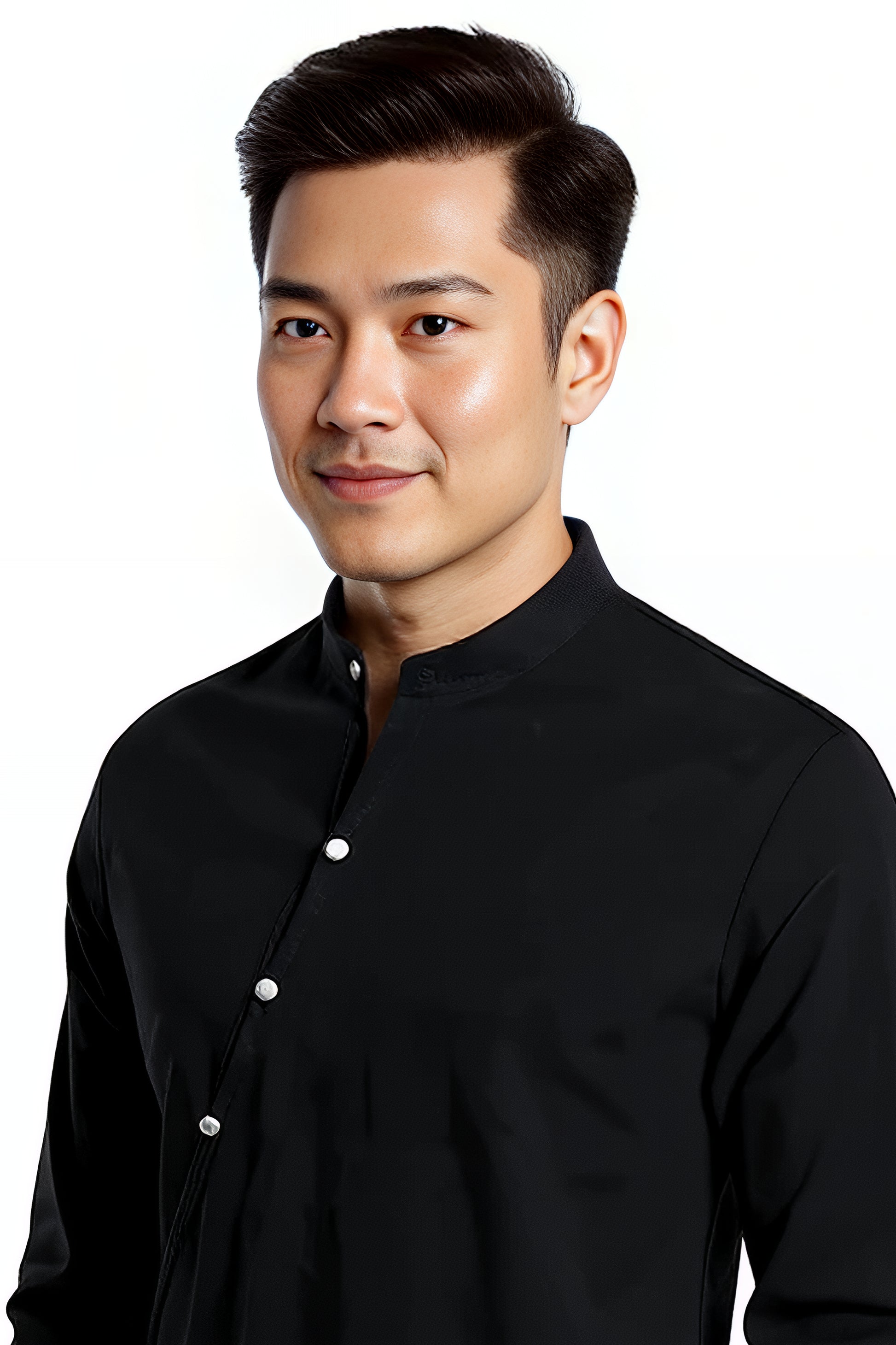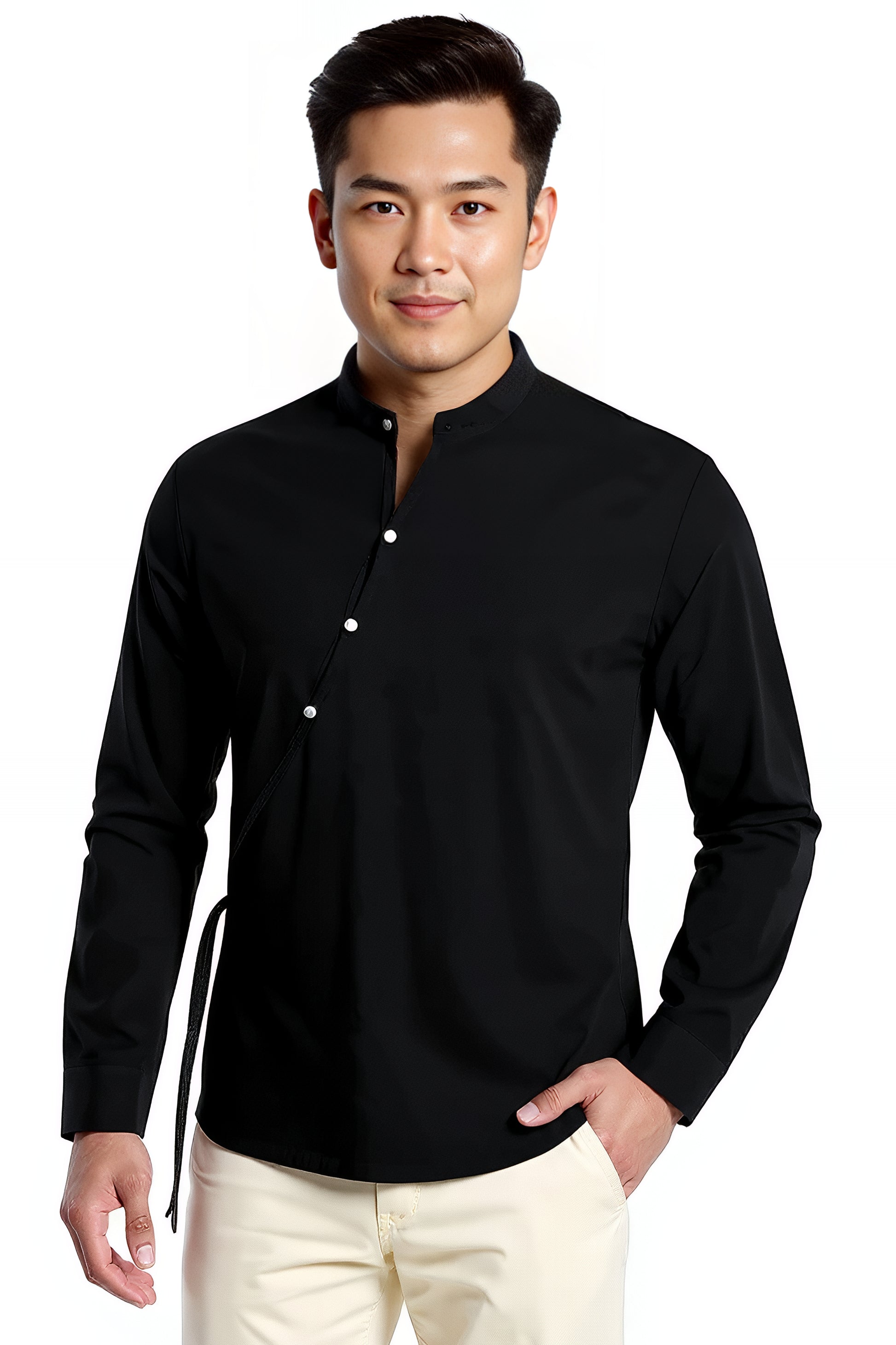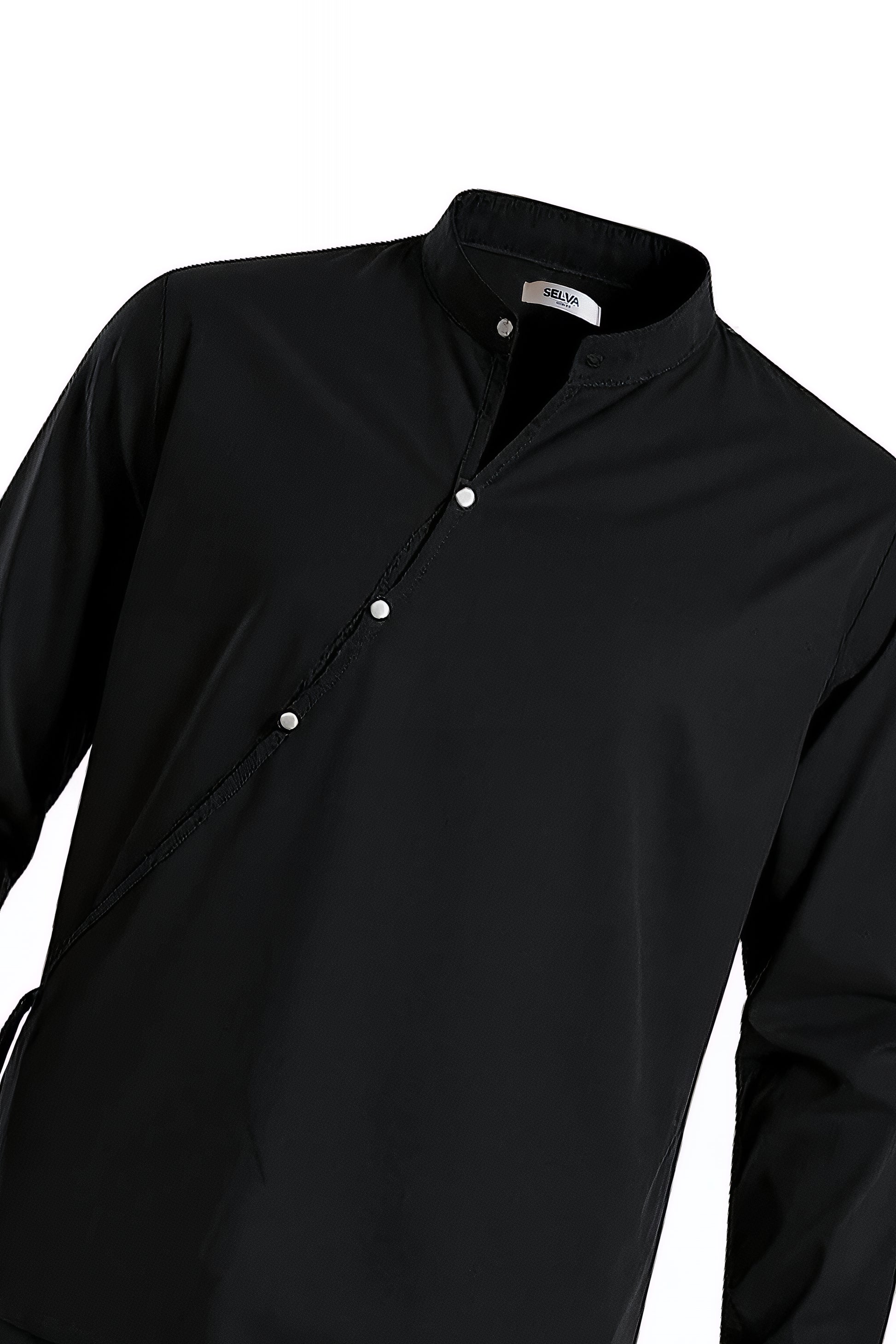 Podnieś poziom z dołączonym czarnym koszuli z długim rękawem, który wyróżnia się stylowym stójkowym kołnierzem i podłączonym asymetrycznym zapięciem na złączach. związek z myślą o swobodnej elegancji i inteligentnym stylu, oferujący dopasowany krój, który jest dokładnie określony przez użytkownika. Idealna na wieczorne wyjście lub półformalne okazje — świetnie komponuje się zarówno ze spodniami materiałowymi, jak i dżinsami.